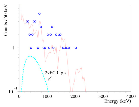 Energy spectrum of and events measured by the CdWO detector for 26,033 h in coincidence with 511 keV annihilation quanta in both of the CdWO counters (circles). The expected background, which was built on the basis of the fit presented in Figure 7, is shown by a red solid line. The excluded distribution of the EC decay of Cd to the ground state of Pd with the half-life yr is shown.