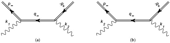 Feynman diagrams of electron–positron-pair production by two gamma quanta (a,b) in the field of an X-ray pulsar. External double lines correspond to Volkov functions of electron or positron, wavy lines correspond to wave functions of initial gamma quanta, and internal double lines correspond to Green’s electron function in the field of a plane electromagnetic wave.