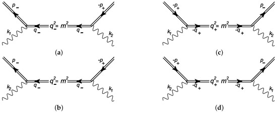 It is sufficient to only consider kinematics of channel (a); the three other channels are obtained from that by index changing. The most probable case is the process with radiation or absorption of only one photon of the external wave in both vertices ( and in Equation (11)) due to the weak field under Equation (2).