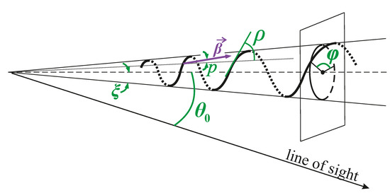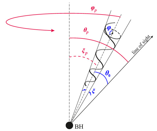 Let us check this assumption. The scheme of the helical jet precession is presented in Figure 8. The dependence of on the azimuth angle of precession is expressed as