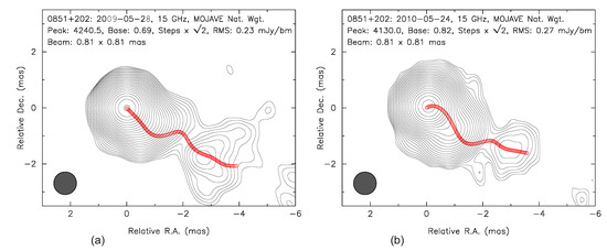 For further calculations, we use the values years and . Analysis of the VLBA images stacked over all available epochs at 15 GHz for a given source for a sample of a few hundred AGN showed that jet features propagate within a certain cone [29]. This result is consistent with the assumption considered by us about the jet shape and allows to accept to further calculations. Then, , which agrees with other estimations of the jet angle with the line of sight performed by the combined analysis of the jet kinematics and the long-term radio variability [30,31]. The helical jet parameters found by us are listed in Table 2.