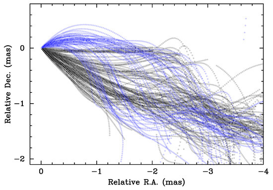- Plavin, A.V.; Kovalev, Y.Y.; Petrov, L.Y. Dissecting the AGN Disk-Jet System with Joint VLBI-Gaia Analysis. Astrophys. J. 2019, 871, 143. [Google Scholar] [CrossRef]
