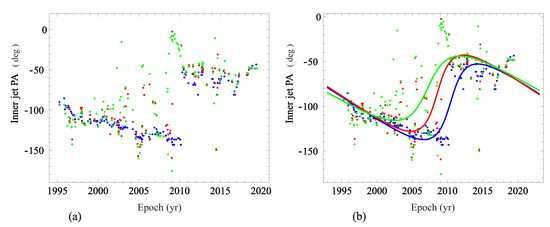 Figure 4 shows that, despite the available spread of points defined in various ways, there is a general trend of decreasing PAin until 2009–2010, followed by an abrupt increase of PAin by about and its further gradual decrease. Note that the sudden change of PAin defined by the major axis of the elliptical Gaussian component fitted VLBI core occurs about a year earlier than the sudden change of PAin defined by the innermost part of the jet ridgeline. This suggests that the cause or conditions in the jet which result in the sudden change in PAin values propagate downstream the jet. Noteworthily, PAin values obtained from 43 GHz VLBA observations correspond to those measured at 15 GHz, but the rapid change in the 43 GHz PAin occurred in the middle of 2004 (Figure 6 in [28]). This can be explained by weaker opacity of synchrotron emission at 43 GHz, which is generated in the jet region located upstream from the 15 GHz VLBI core.
