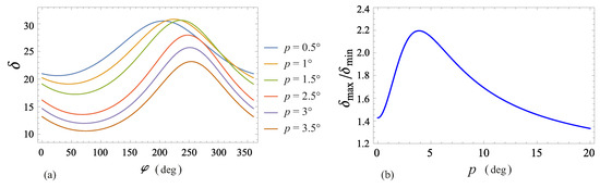 Dependence of the Doppler factor on p: (a) Doppler factor versus the azimuth angle for various p and (b) ratio of maximum and minimum values of Doppler factor as a function of p.