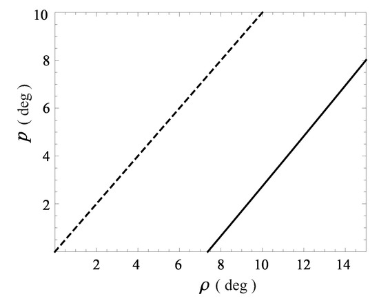 is substituted into Equation (3). Values of from Formula (5) are equal to those calculated from Formulae (11)–(13) in [26] under the corresponding parameters. Figure 5 shows that maximum values of are reached for small p. For example, if , then , while at , the maximum value is no higher than . Since the 12-year optical flares have large amplitudes, for the interpretation of these flares by a change in , it is natural to assume such p at which the following conditions are fulfilled. First, reaches a high value at the maximum. Second, the ratio of maximum and minimum values of is close to the maximum of possible ones. Figure 5 shows that it occurs at .