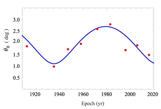 We have taken into account that for the range of azimuth angle from 0 to . The parameters used in Formula (14) and derived viewing angle values for each peak are listed in Table 3. Fitting the values by the expression (12), we obtained , and the precession period in the observer’s reference frame years. The dependence of with time is shown in Figure 9.