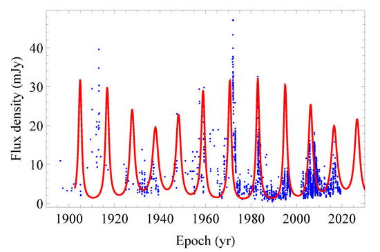 Inserting into Equation (3) the expression for (5), in which and are given by Formulae (12) and (11), correspondingly, and solving Equation (13) with respect to , substituting the observed flux densities of the 12-year peaks and minima between them, we obtained
