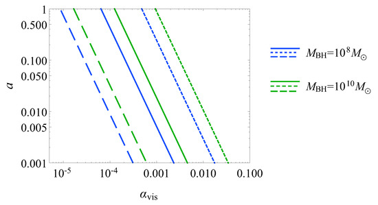 where is the dimensionless parameter expressing a black hole’s specific angular momentum, is the viscosity parameter, and and are the mass and mass accretion rate of the black hole, respectively. We expressed the Formula (16) as