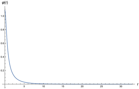 with C being an arbitrary constant. However, using the symmetry (17), we can renorm the obtained solution by shifting its asymptotic value to the Halileian one represented in (14). Typical forms of the scalar and shifted electric potential fields, together with the two metric functions for the values of parameters , which correspond to the local minimum of energy, see below, are plotted in Figure 1, Figure 2, Figure 3 and Figure 4 respectively. We see that the metrics do not change their signature, so that all the obtained solutions are free of horizon. We note that in the neutral case, when the electromagnetic field is absent, such a property was first discovered in [30] and analytically proved later in [31] (called the “no-go theorem” therein).