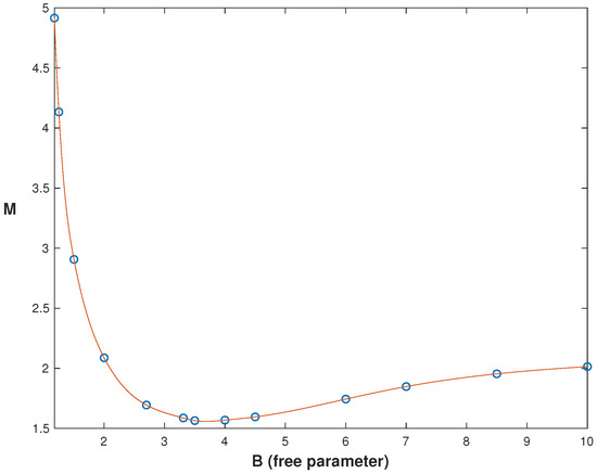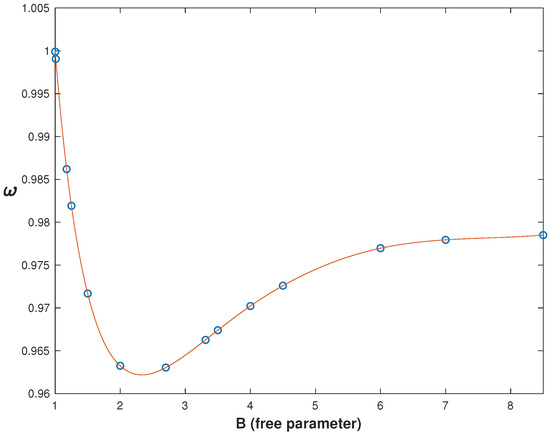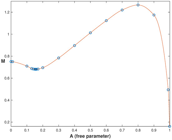 In our model, the dependence of the mass M and the frequency on the parameter A are represented in Figure 8 and Figure 9, respectively. One of the two local minima of energy corresponds to and, in the minimum M, is equal to ; the other, deeper minimum is achieved when A, together with , approach the extreme allowed value equal to unity; the minimal value of energy is then about . Note also that the frequency values are located again in a narrow interval near the cut-off value .
