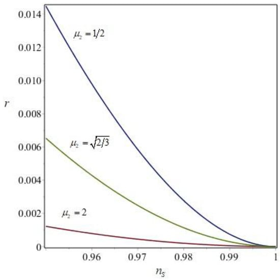 Thus, the Starobinsky inflation can be considered as the partial case of exponential power-law inflation with the specific choice of the parameters for the complex scalar field with the variable real part and constant imaginary part. For the constant parameter one does not have the explicit expression for the type of -gravity from Equations (30) and (31). However, one can consider EPL inflation in the Einstein frame, which is connected with -gravity expressed in parametric form.