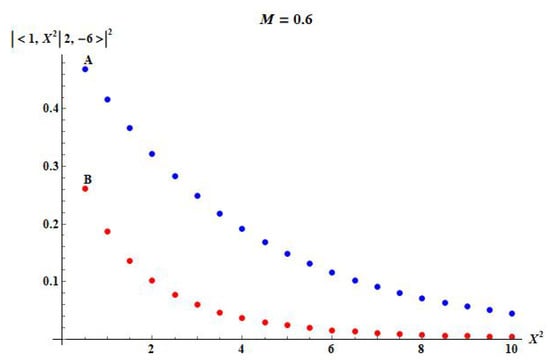 One can distinguish four types of such states. The states with , , correspond to sector I of the Penrose diagram in Figure 2. In a zero gravity limit, this sector corresponds to positive frequency solutions of the Klein–Gordon equation. The states with , , correspond to sector in Figure 2. In a zero gravity limit, this sector corresponds to negative frequency solutions of the Klein–Gordon equation. The states with , , correspond to sector in Figure 2. The zero gravity limit keeps no trace of such kind of states. The states with , , correspond to sector in Figure 2. The zero gravity limit keeps no trace of such kind of states. We calculate numerically matrix elements between various states of the type