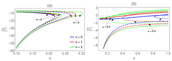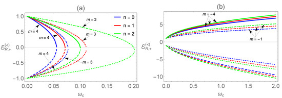 The sketch of as a function of rotation is depicted in Figure 3. Considering , and , we see that the increases when n is increased and m is decreased. For simplicity’s sake, we consider and (Figure 3a). On the other hand, when we consider the parameters , and for and , we see that the energy states of the particle (solid and dashed-dotted lines) are closer to each other while those of the antiparticle (dashed and dotted line) are more separated when approaches 1 (Figure 3b).
