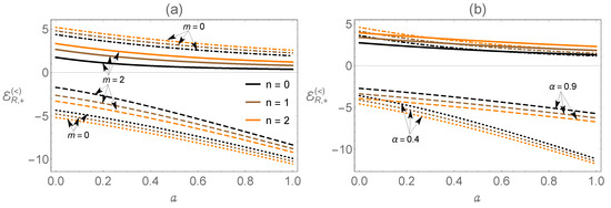 The above energies present some curious characteristics. When we compare the energies and , we see that they are the same. The same occurs when we compare , and . We also notice that and are independent of the parameters m, , and a while and are given in terms of all the physical parameters involved in the model. The energies of the regular solution (70) and (71) can be compared with the energies (47) and (50) of Ref. [55], respectively, for the particular case when the cyclotron frequency plays the role of the Dirac oscillator frequency. We make some energy sketches as a function of some parameters of the system. In all the figures, we consider . Because of the dependence on all the parameters of the model and the similarity with the other energies, we prefer to analyze only the energy (71). We use solid and dashed-dotted lines to represent the energy of the particle and dashed and dotted lines to the antiparticle. In Figure 1, we investigate the profile of as a function of . When , and , the spectrum is located in the energy range . In addition, we also note that the energies increase when is increased or equivalently, when the magnetic field B is increased (Figure 1a). This is verified for (blue color), (red color) and (green color) for and (both identified in the figures). On the other hand, when we change the curvature and the flux to and and keeping the same parameter a, the spectrum assumes the profile of Figure 1b (for and ). In this case, we can see that the energies increase when n increases and m decreases. In both cases, we can also clearly see that the spectrum is not symmetrical about . In fact, when in Equations (71), (73), (74) and (76), the symmetry is recovered.