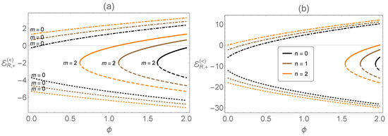 When we investigate the profile of as a function of , we verify that the spectrum is negative (Figure 2). In particular, when , and for and , we can see that the energies increase when is increased and m is decreased (Figure 2a). Furthermore, energies are only allowed for . In Figure 2b, we show the profile for , and for and . For this configuration, we see that increases when n increases. However, when the rotation is lower, ranges of emerge in which the energy is forbidden.