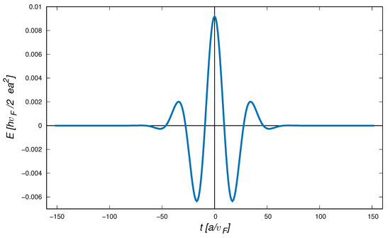 Note that the Dirac Hamiltonians do not commute at distinct time instants, if . In the model under consideration, the dispersion law holds true in a vicinity of the Dirac point at the boundaries of the Brillouin zone. This model corresponds to low-energy excitations of the carries. However, the approach under consideration allows for a generalization to a tight-binding model of the nearest neighbor interaction (see References [31,40,73]), as demonstrated in Ref. [54].