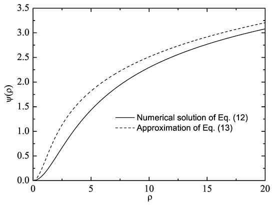 For a spherically symmetric and—approximately point-like—distribution of mass, we will have (from Equation (7)), the boundary conditions: , . The result for the numerical integration of Equation (12) is shown in Figure 1. Although analytic integral of this differential equation can be obtained, it is useful to consider the approximation:
