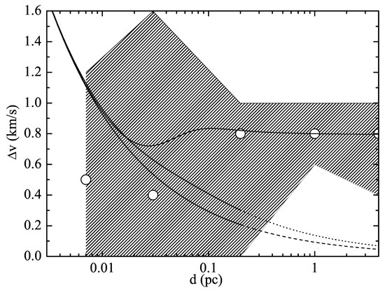 Observations of Hernández et al. [72] for the relative velocity of two binary stars of mass equal to that of the Sun at separations ranging from pc to 4 pc. The estimated relative velocities are shown as open circles, with uncertainty corresponding to the shaded area. Predictions of Newtonian theory are given by the lower dashed line. The dotted line is the MOND prediction and the solid line is the prediction of the MNG as discussed in this paper for and AU. Notice the similarity of the predictions of MNG with MOND without the external field effect as discussed by Banik and Zhao [80]. This could falsify the MNG model in light of the data release 2, as discussed by Pittordis and Sutherland [81].