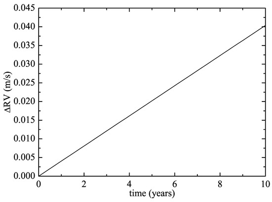 Taking into account the epoch of periastron in Table 1 we can estimate the true anomaly today as by using the standard equations connecting the true anomaly with the eccentric anomaly and time [90]. After ten years the true anomaly becomes . By using the Equations (26)–(36) with the parameters in Table 1 and considering a interval of time of ten years from now we obtain the results in Figure 3 for the perturbation of the radial velocity as a consequence of the non-Newtonian force in the MNG model.