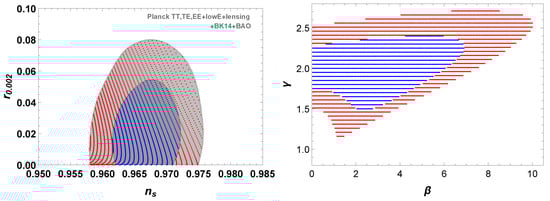 The constraints on and from Planck data [5] and the theoretical predictions for the parameterization (26) in the high friction limit. The Planck constraints on and r are displayed in the left panel and the constraints on and for are displayed in the right panel. The red and blue regions denote the and confidence level, respectively.