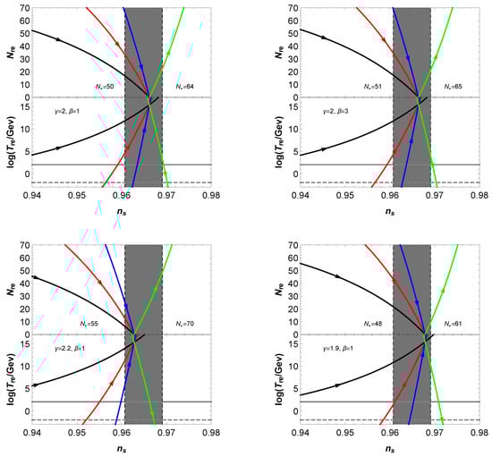 For different kinds of , , N and , by using Equations (27), (50) and (51), we calculate the corresponding spectral tilt , reheating e-folds and reheating temperature , and the results are displayed in Figure 3.