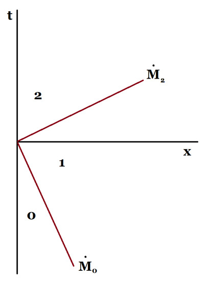 The collision of shock waves, usually ultrarelativistic, is also used in the hydrodynamic theory of interaction of elementary particles [24]. A symmetric collision is equivalent to the problem of a wave hitting a stationary wall. In Figure 1, three areas are highlighted: 1, and 2. In the region 0 equilibrium: the values are set. In region 1—parameters of the incident wave, among them, due to the conditions at the discontinuity are (21) and (22)—only one can be set independently. Choose , as in the statement of the piston problem. In the 2 area, the speed other parameters are searched. In addition, we need to find the mass velocities of shock waves and . Thus, six conditions at the break allow you to define six parameters. For a perfect gas, this is possible due to the evolutionary nature of discontinuities. Note that the conditions (21) and (22), by virtue of for both shock waves, are exactly the same, so excluding the variables and on each side, we obtain the same quadratic equation for the quantities and , which represent its solutions with different signs. The coefficients of this equation also depend on the parameters of the state of the incident wave which are expressed in terms of and . For a perfect gas, we have