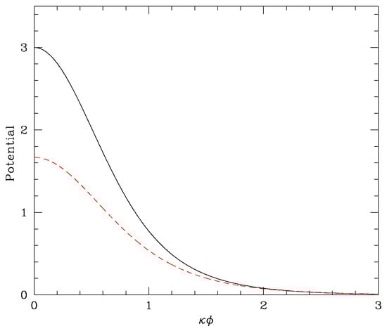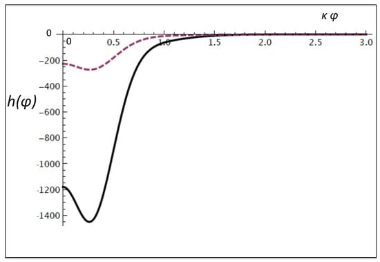 The “vacuumon” potential for a classical scalar field representation of the early-Universe RVM. Solid line: generic RVM [34], with early-epoch relativistic matter present, with equation of state (EoS) . Dashed line: string-inspired RVM [1,2], with early-epoch massless “stiff” stringy (gravitational axion) “matter” present, with EoS . The potentials are defined for positive values of the vacuumon field .