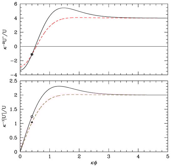 As explained in [34], the potentials (38) or (40) are defined only for positive values of the vacuumon field, (+ branch of solutions for in (36)). They both have a “hill-top” shape (see Figure 1), exhibiting a local maximum for a zero value of the classical vacuumon field , and then decaying to zero for large values, which represents the decay of the “false” vacuum representing the graceful exit from the inflationary phase àl RVM [27,28,29,30,31,32,34]. The features between the generic and string-inspired RVM are thus qulatitatively similar, with only minor, unimportant, differences in the range of the parameters.