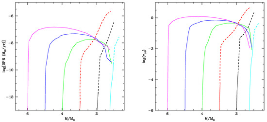 The stars descending from progenitors produce silicates, alumina dust and solid iron only, because HBB prevents the formation of C-stars. The largest DPR and optical depths are reached when the HBB is at the maximum efficiency, in conjunction with the largest values of the luminosity and the mass-loss rate. It is clear from Figure 1 that the peak values of DPR and increase with the initial mass of the star, because the higher the mass the stronger the HBB experienced, which makes the stars to evolve at larger luminosities and mass-loss rates, which favours higher densities of the wind [4,5].