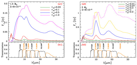 The stars in the low-mass domain evolve initially as M-stars and exhibit the silicate features at m and m. The features become more and more prominent during the evolution, owing to the increase in the optical depth. After the star becomes a C-star the silicate feature is replaced by the SiC one, centered at m. We notice in Figure 2 the m bump, generally attributed to the presence of MgS dust. On this regard, we believe important to warn the reader that there is still no general consensus that MgS is indeed the carrier for the broad m feature, because MgS grains cannot well fit the observed feature without introducing the elliptical-shaped grains. Other possibilities, e.g., graphite, are currently considered. Here we follow the analysis by [18], who presented a number of arguments in favour of the MgS hypothesis. In every case, the rise in the mid-IR fluxes is connected to the increase in , in turn related to the larger and larger amounts of dust formed in the wind.