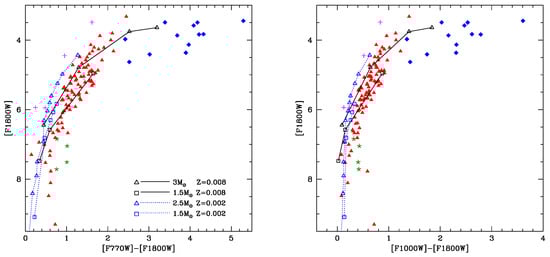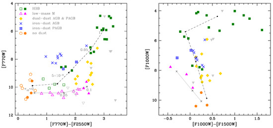 One of the main results of [15] was that the observational plane allowing the most exhaustive characterisation of M-type AGBs is the colour-magnitude ([F770W]−[F2500W], [F770W]) diagram. The left panel of Figure 3 shows with coloured points the distribution of the sample stars in this diagram, and two sequences of low-mass and massive AGB stars, calculated on the basis of synthetic modelling. The solid line refers to the evolution of a star (limited to the phases during which the star is oxygen-rich). The reddening sequence is almost horizontal, because: (a) the luminosity of the stars during the oxygen-rich phase is within the range; (b) when increases, the m feature becomes more prominent, while the flux in the m region keeps approximately constant, owing to the presence of a clear minimum of the SED in that region of the spectrum (see the red and green lines in the left panel of Figure 2). The evolutionary sequence of stars (not shown) extend to [F770W]−[F2500W], because, as discussed in Section 2.2, these stars produce negligible quantities of dust during the O-rich phase. The dashed sequence refers to the evolution of a model, taken as representative of the stars experiencing HBB. The tracks of stars would be overlapped to the dashed line in the left panel of Figure 3, because the most relevant physical quantity in this context is the temperature at the base of the envelope, which determines the strength of HBB, thus the luminosity and the rate of dust production [5]. The difference among stars of different mass is that the higher the initial mass of the star the larger the maximum reached during the AGB phase (see Figure 1).