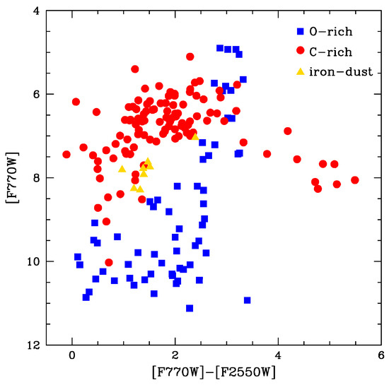 We have discussed separately the diagrams most suitable to characterise carbon stars and oxygen-rich sources. On the other hand it is important to consider observations aimed at investigating the whole AGB population, to be applied to other galaxies in the Local Group. On this regard, we suggest the ([F770W]−[F2500W], [F770W]) diagram as the best diagram to study dusty AGB sources. As shown in Figure 5, carbon stars and M-type AGBs define two distinct sequences, which can be used to distinguish stars belonging to either groups.