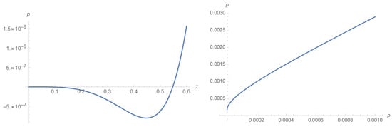 An example of EoS given by (32) and (33) with and . Left: it shows the region of which should be excluded when solving TOV configurations of dark stars although it may yield gravastar configurations. Right: the plot of EoS for the phsyical region. The unit of p is , and the unit of is , and is dimensionless.