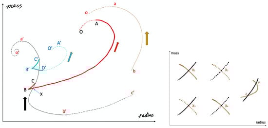 The various curves and intersections of mass–radius relations used to demonstrate the (reverse) BTM criteria in the main text. Solid lines indicate stable parts, while the dotted lines are for unstable parts. Left panel: Various mass–radius curves. The thick arrows indicate the directions of increasing core pressures for each branch. Right panel: Summary of the situations of intersections. is a stable point where both the neutron branch (black) and the dark branch (brown) are stable. is unstable since both branches are unstable. and show the saddle instability that one of the two branches is unstable. In some cases, the two branches may cross twice like points Y and Z; then, at least one of them is a fake intersection.