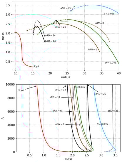 For scenario III, by applying the (reverse) BTM stability criteria to the resultant mass–radius relation shown in Figure 4, no stable stars around 2.6 can be formed. The pure SLy4 neutron stars are marked in red as the reference configurations. For the hybrid stars, case is denoted by the brown lines, and case by the green lines. Now, we need the core pressures for both dark and nuclear matters to solve the TOV configurations. By tuning one of the core pressures and fixing the other, we can obtain the so-called dark branch and neutron branch as discussed in Section 3. In Figure 4, the dark branches are denoted by the dash-dotted lines and the neutron branches by the solid lines.