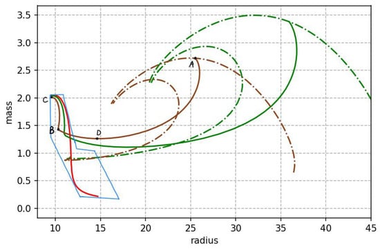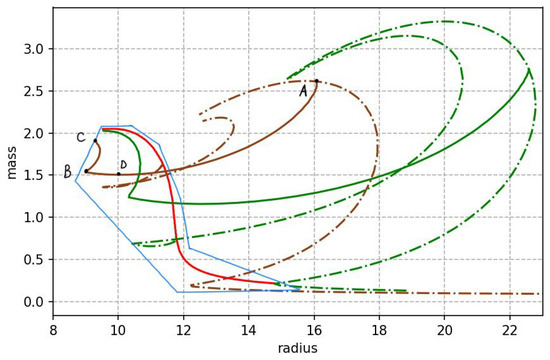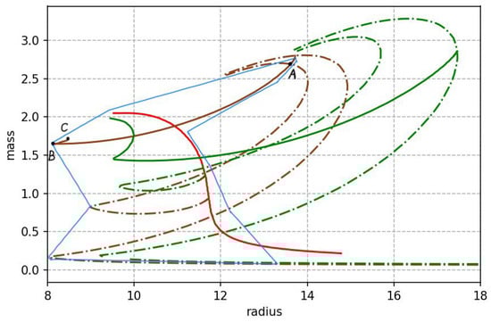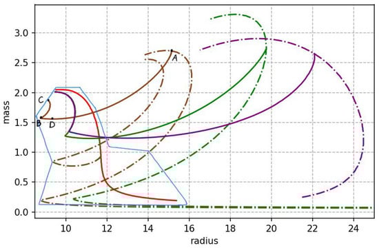 In Figure 5, it shows the mass–radius relations for the hybrid stars of scenario III made of nuclear matter of SLy4 EoS and dark matter of model’s EoS with (brown lines) and (green lines). The pure SLy4 neutron stars are marked in red as before. Similarly, the neutron and dark branches are denoted by solid and dash-dotted lines, respectively; and then we apply the (reverse) BTM criteria to judge the saddle (in-)stabilities as before. We find that the line marked in Figure 5 bends higher than that in Figure 4, but still point A is unstable because of the existence of the minimum point D, as Section 3 tells us. Again, the stable regions are near the pure star configurations, and for the case of are circled by the blue closed path. Again, we find that the maximal mass of the stable hybrid stars of this kind cannot be higher than the maximal mass, i.e., 2.1 of pure neutron stars, similar to the case.