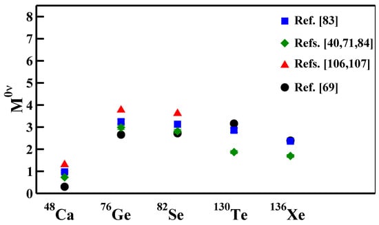 The scale on the y-axis is consistent with the one employed in Figure 5 of [17]. We stress that our criteria rule out, for the sake of consistency, results from SM calculations where alternative approaches have been followed. For example, we recall that Horoi and coworkers have extensively performed calculations beyond the closure approximation [71,84,87]. In particular, as already mentioned several times, results for the of Ca calculated with and without the closure approximation differ by ∼10%. Likewise, we neglect the results of large-scale SM calculations, where model spaces larger than a single major shell are used. This is the case, for instance, of the work by Horoi and Brown [39] and by Iwata and coworkers [126]. In the former, the authors showed how the enlargement of the standard model space by the inclusion of the spin–orbit partners of g and h orbitals leads to a 10–30% reduction of the calculated for the Xe emitter. In the latter, the authors reported the results for the of Ca based on large-scale shell-model calculations including two harmonic oscillator shells ( and shells). They found that is enhanced by about 30% with respect to -shell calculations when excitations up to are explicitly included.