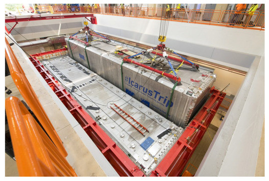 - Amerio, S.; et al. [ICARUS Collaboration] Design, construction and tests of the ICARUS T600 detector. Nucl. Instrum. Meth. A 2004, 527, 329. [Google Scholar] [CrossRef]