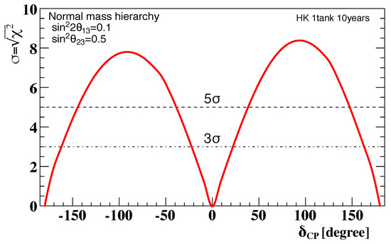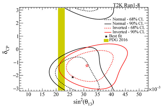 - Abe, K.; et al. [T2K Collaboration] Sensitivity of the T2K accelerator-based neutrino experiment with an Extended run to 20 × 1021 POT. Available online: https://arxiv.org/abs/1607.08004 (accessed on 10 February 2020).