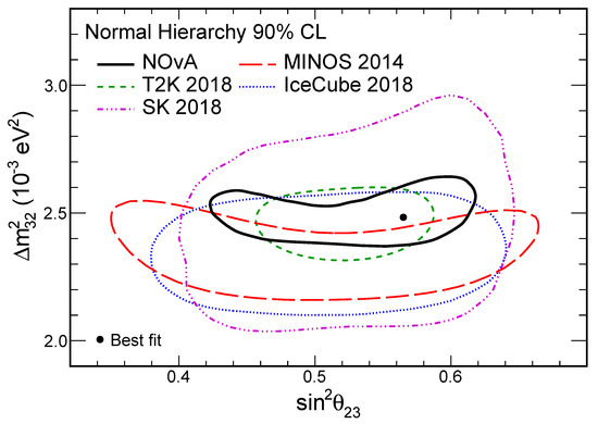 At the time of writing [77], the T2K and NOA results [65,78,79,80] are compatible for all oscillation parameters (see Figure 6). NOA data indicate a slight preference (1.8 ) for normal hierarchy (), which corroborates the hint from atmospheric neutrino data [14].