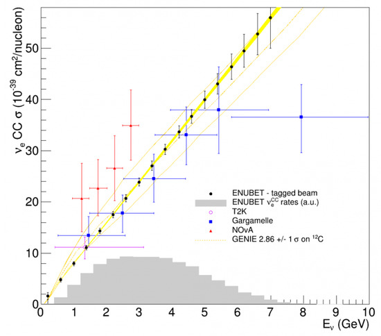 - Longhin, A.; Ludovici, L.; Terranova, F. A novel technique for the measurement of the electron neutrino cross section. Eur. Phys. J. C 2015, 75, 155. [Google Scholar] [CrossRef]