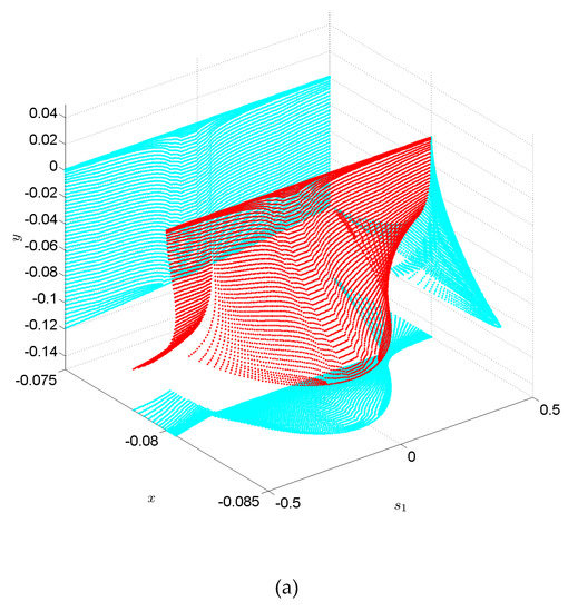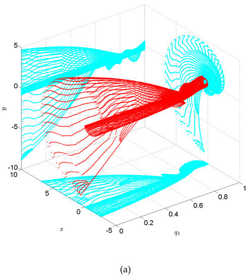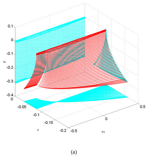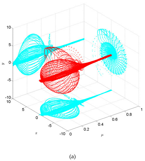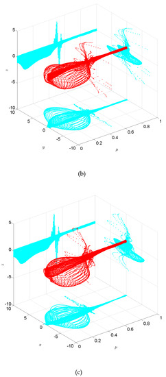 For the given values of Table 1, we selected the iterative initial value and limit parameter in the interval . By applying the ode45 numerical integration algorithm [32], we obtain the results in Figure 1; namely, the bifurcation diagrams of three state variables, frames of , , and , in terms of mass parameter in the binary HD 191408 system. Figure 1a shows the effect of in the frame; for a given value of , the bifurcation diagram in the frame in terms of is obtained. Figure 1a also shows the bifurcation diagrams of variables and in terms of , i.e., the projection from the three-dimensional diagram to the two-dimensional plane. The projections have similar structure, which is inevitable in qualitative analysis by comparing the projections. Similarly, the bifurcation diagrams in the and frames in terms of are shown in Figure 1b,c.