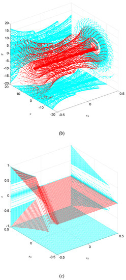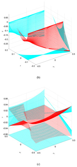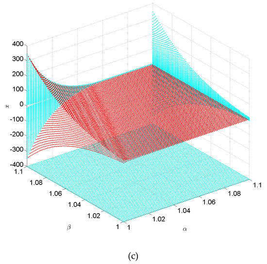 Similarly, we select and restrict the triaxial coefficient to the interval . The bifurcation diagrams of the state variables with respect to the triaxial coefficient are shown in Figure 2 and Figure 3. Figure 2a shows that the triaxial coefficient of the first primary has little effect on the motion amplitude of the third particle in the direction, although it will cause the overall displacement of the third particle in this direction. It has a great influence on the movement of the third particle in the direction, especially when takes the threshold value around ±0.32, the movement of the third particle in the direction will be the opposite. Figure 2b shows that the triaxial coefficient of the first primary will cause the motion amplitude of the third particle to expand gradually in the direction, and when takes the threshold value of 0.07 in the direction, the movement of the third particle in this direction will also be in the opposite direction. Figure 2c shows that the combination of the triaxial coefficients and acts on the third particle in the direction. The result shows that the effect on the dynamic behavior of the third particle is greater when their values pass the threshold and .