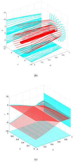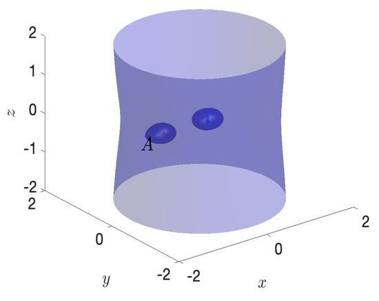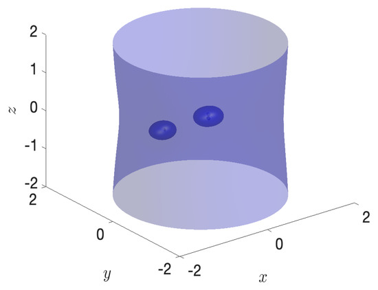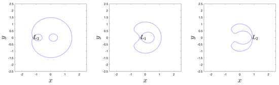According to the discussion of zero velocity surface, when C takes 2.914, 2.1943, and 1.9777, the related zero velocity curves are shown in Figure 11. Therefore, three collinear equilibrium points are , , and , respectively.
