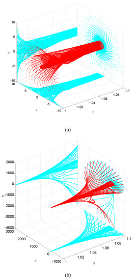For the values of the Coriolis and centrifugal forces, which are restricted in the interval . The bifurcation diagram in Figure 5a shows that the modification in the Coriolis force has a similar effect on the third particle in the and directions, both of which tend to a certain range gradually with the increase of from large-scale motion. From Figure 5b, we find that the movement of the third particle in the and directions appears divergent as the modification in the centrifugal force increases; that is, the movement amplitude in both directions increases. However, the third particle shows periodic motion in the direction with the increase of and .