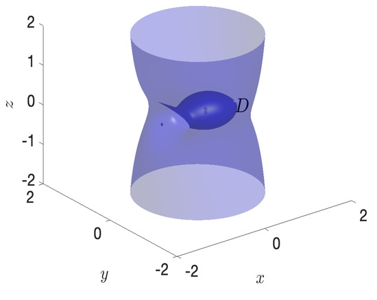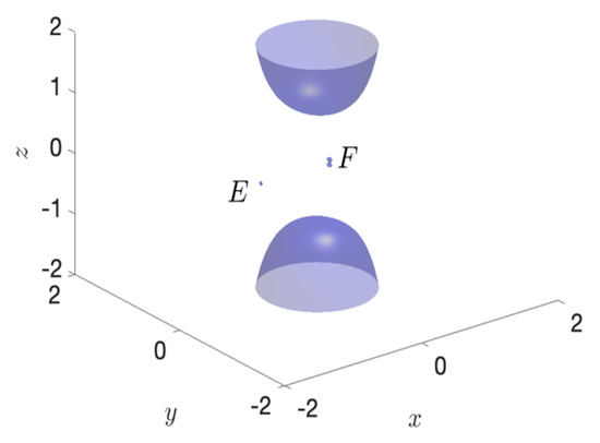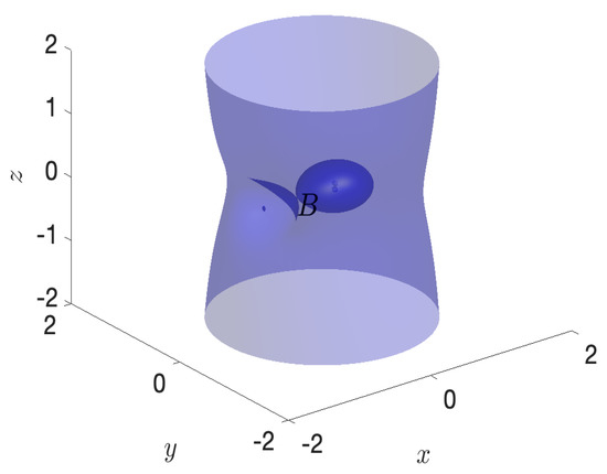 For the Jacobi-type function (4) of the system, when the motion velocity of the third particle is zero, the three-dimensional space of the system with the change of Jacobi constant C is shown in Figure 6, Figure 7, Figure 8, Figure 9 and Figure 10. When C decreases from C = 3, five equilibrium points A, B, D, E, and F can be obtained. A smaller C value corresponds to the larger permissible regions of motion of the third particle. The specific analysis is as follows: