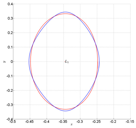 For the collinear equilibrium point around which the periodic orbits are obtained, as shown in Figure 12, the red curve is up to the second-order terms, and the blue curve is about the third-order ones. By comparing these two orbits, we find that these two orbits are close to each other.