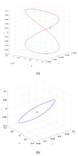 The periodic orbits around the collinear equilibrium point are plotted in the spatial space as shown in Figure 13. Figure 13a is a periodic orbit up to the second-order terms, and Figure 13b is a periodic orbit up to the third-order terms. Because we selected different solutions in terms of , i.e., effects of various of factors of deformation, orbital vibration, and motion, there are different forms of orbits.