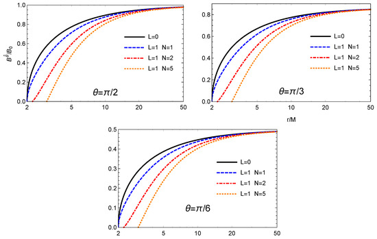 Radial dependence of normalized angular component of magnetic field for different angles with different values of conformal parameters L and N. The top left panel is for , the top right one is for and the bottom one is for .