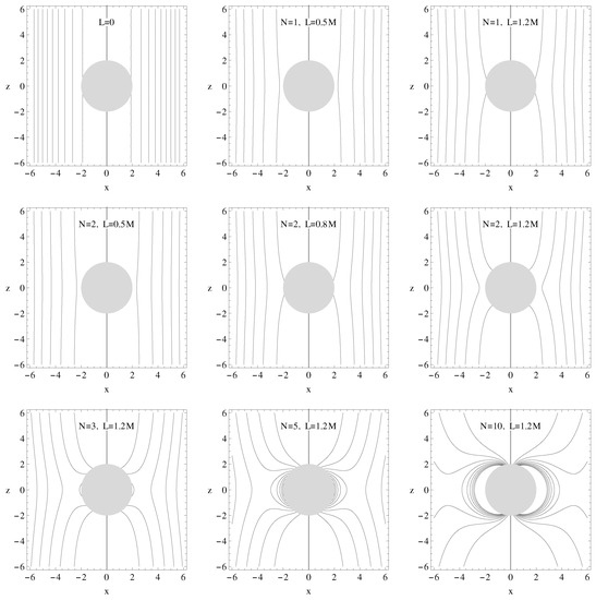 Profiles of the magnetic field lines for the different values of the conformal parameters L and N on plane (where new coordinates are defined as and ).